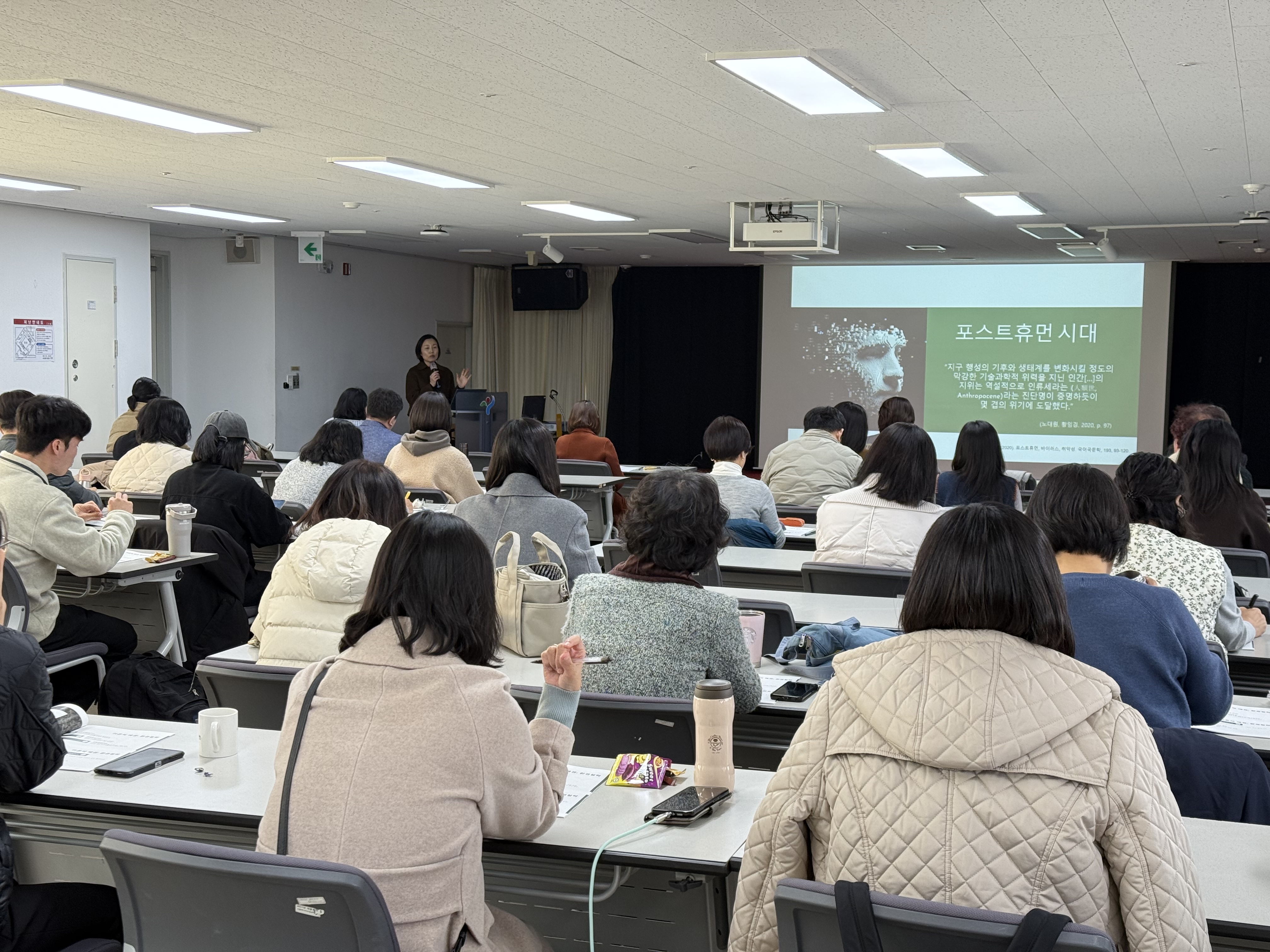 ○ 이어서 강의한 경기도교육연구원 엄수정 교육협력부장은 포스트휴먼 생태주의 관점에서 ‘관계로 배우는 기후변화 교육’을 설명하며 기후교육이 단순한 정보 전달을 넘어 관계·연결의 관점으로 확장되어야 함을 포스트휴머니즘적 철학적 배경과 다양한 사례를 통해 강조했다.