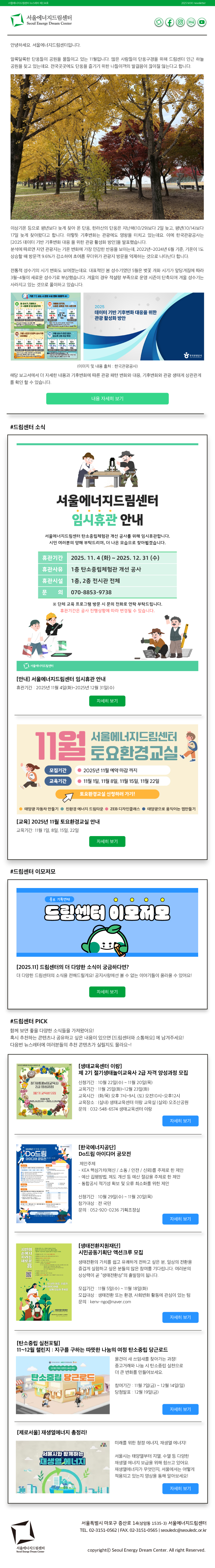 뉴스레터 홍보실 뉴스레터 뉴스레터 프로그램 리뷰 뉴스레터 센터리포트 홍보자료 자료실 SEDC 외부영상 서울에너지드림센터 뉴스레터 제134호 작성자서울에너지드림센터 등록일2025.11.08 조회수22 이전글 서울에너지드림센터 뉴스레터 제133호 다음글 [세미나] <기후위기대응을 위한 탄소중립실현 제로에너지건축물(ZEB) 지역 확산 세미나>세미나 참여 모집 목록