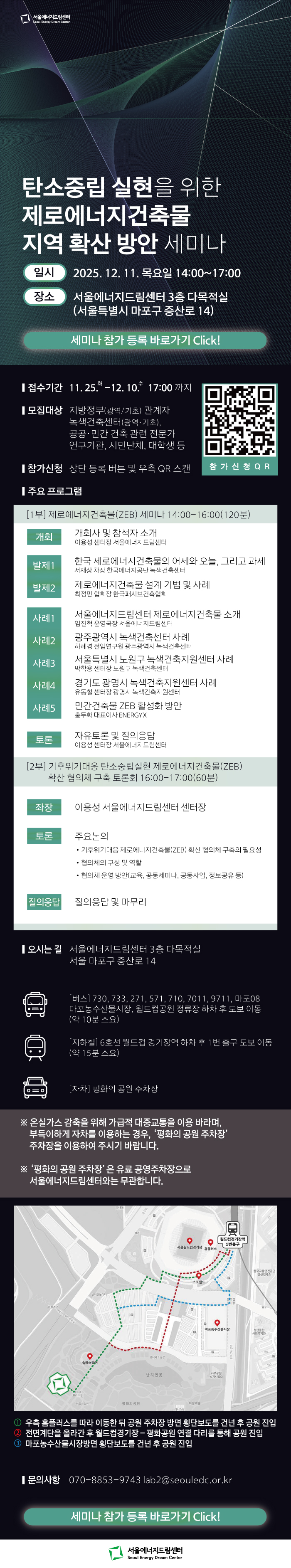 뉴스레터 홍보실 뉴스레터 뉴스레터 프로그램 리뷰 뉴스레터 센터리포트 홍보자료 자료실 SEDC 외부영상 [세미나] <기후위기대응을 위한 탄소중립실현 제로에너지건축물(ZEB) 지역 확산 세미나>세미나 참여 모집 작성자서울에너지드림센터 등록일2025.11.30 조회수6 이전글 서울에너지드림센터 뉴스레터 제134호 목록
