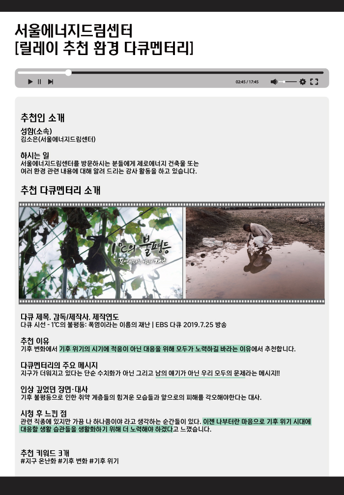 센터리포트 홍보실 센터리포트 센터리포트 프로그램 리뷰 뉴스레터 센터리포트 홍보자료 자료실 SEDC 외부영상 [환경리포트] 릴레이 추천 환경 다큐멘터리 | 다큐 시선 -1℃의 불평등: 폭염이라는 이름의 재난(EBS다큐 2019.07.25 방송) 작성자서울에너지드림센터 등록일2025.11.12 조회수13 다큐 함께보기 이전글 [환경리포트] 릴레이 추천 환경 다큐멘터리 | 다큐프라임-여섯 번째 대멸종 5부 멸종위기종 인류(EBS다큐 2021.12.28 방송) 다음글 [환경리포트] 릴레이 추천 환경 다큐멘터리 | 다큐온 푸른 탄소, 지구를 식히다(KBS 2025.04.19 방송) 목록