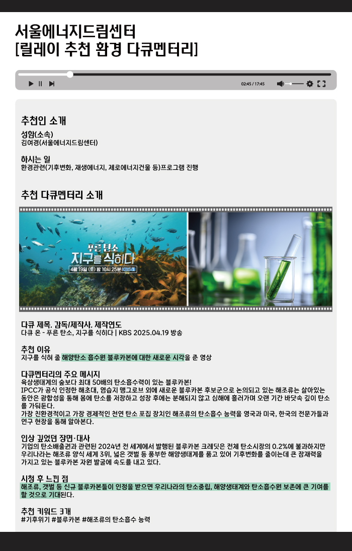 센터리포트 홍보실 센터리포트 센터리포트 프로그램 리뷰 뉴스레터 센터리포트 홍보자료 자료실 SEDC 외부영상 [환경리포트] 릴레이 추천 환경 다큐멘터리 | 다큐온 푸른 탄소, 지구를 식히다(KBS 2025.04.19 방송) 작성자서울에너지드림센터 등록일2025.11.13 조회수9 다큐 함께보기 이전글 [환경리포트] 릴레이 추천 환경 다큐멘터리 | 다큐 시선 -1℃의 불평등: 폭염이라는 이름의 재난(EBS다큐 2019.07.25 방송) 다음글 [환경리포트] 릴레이 추천 환경 다큐멘터리 | 나의 두 번째 교과서: 과학 11강 날씨와 기후, 식탁 위의 물가를 올리는 기후(EBS2 2024.11.11 방송) 목록