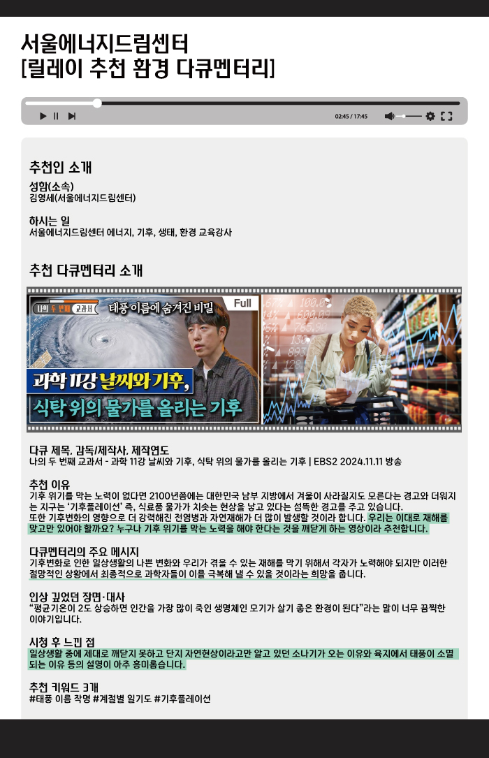 센터리포트 홍보실 센터리포트 센터리포트 프로그램 리뷰 뉴스레터 센터리포트 홍보자료 자료실 SEDC 외부영상 [환경리포트] 릴레이 추천 환경 다큐멘터리 | 나의 두 번째 교과서: 과학 11강 날씨와 기후, 식탁 위의 물가를 올리는 기후(EBS2 2024.11.11 방송) 작성자서울에너지드림센터 등록일2025.11.13 조회수10 다큐 함께보기 이전글 [환경리포트] 릴레이 추천 환경 다큐멘터리 | 다큐온 푸른 탄소, 지구를 식히다(KBS 2025.04.19 방송) 다음글 [환경리포트] 릴레이 추천 환경 다큐멘터리 | EBS특별대담 기후위기, 잃어버린 사계절을 찾아서(EBS다큐 2025.08.21 방송) 목록