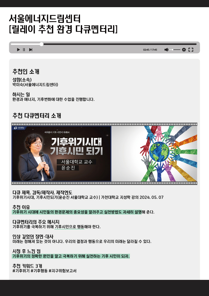 센터리포트 홍보실 센터리포트 센터리포트 프로그램 리뷰 뉴스레터 센터리포트 홍보자료 자료실 SEDC 외부영상 [환경리포트] 릴레이 추천 환경 다큐멘터리 | 기후위기시대, 기후시민되기(윤순진 서울대학교 교수) (가천대학교 지성학 강의 2024.05.07강의) 작성자서울에너지드림센터 등록일2025.11.18 조회수31 다큐 함께보기 이전글 [환경리포트] 릴레이 추천 환경 다큐멘터리 | EBS특별대담 기후위기, 잃어버린 사계절을 찾아서(EBS다큐 2025.08.21 방송) 다음글 [환경리포트] 릴레이 추천 환경 다큐멘터리 | 알아두면 쓸데없는 지구별 잡학사전 中 이상기후! 지구별 멸망하다? (tvN 2023.09 방송) 목록