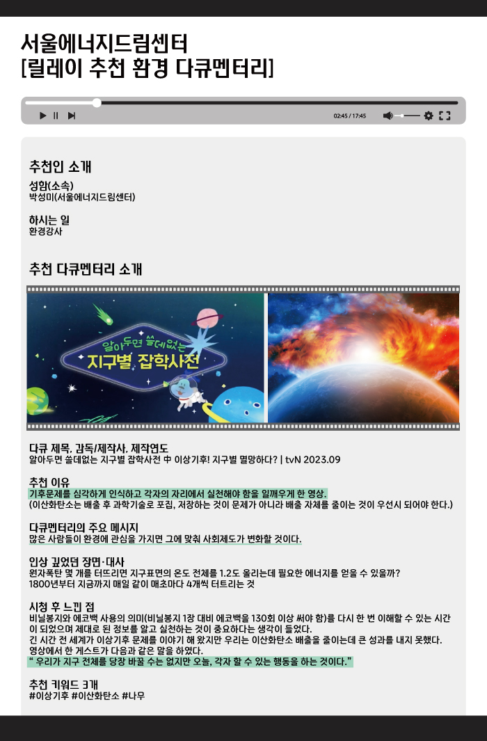 센터리포트 홍보실 센터리포트 센터리포트 프로그램 리뷰 뉴스레터 센터리포트 홍보자료 자료실 SEDC 외부영상 [환경리포트] 릴레이 추천 환경 다큐멘터리 | 알아두면 쓸데없는 지구별 잡학사전 中 이상기후! 지구별 멸망하다? (tvN 2023.09 방송) 작성자서울에너지드림센터 등록일2025.11.18 조회수41 다큐 함께보기 이전글 [환경리포트] 릴레이 추천 환경 다큐멘터리 | 기후위기시대, 기후시민되기(윤순진 서울대학교 교수) (가천대학교 지성학 강의 2024.05.07강의) 다음글 [환경리포트] 릴레이 추천 환경 다큐멘터리 | 하나뿐인 지구 플라스틱 인류(EBS다큐 2016.07.22 방송) 목록