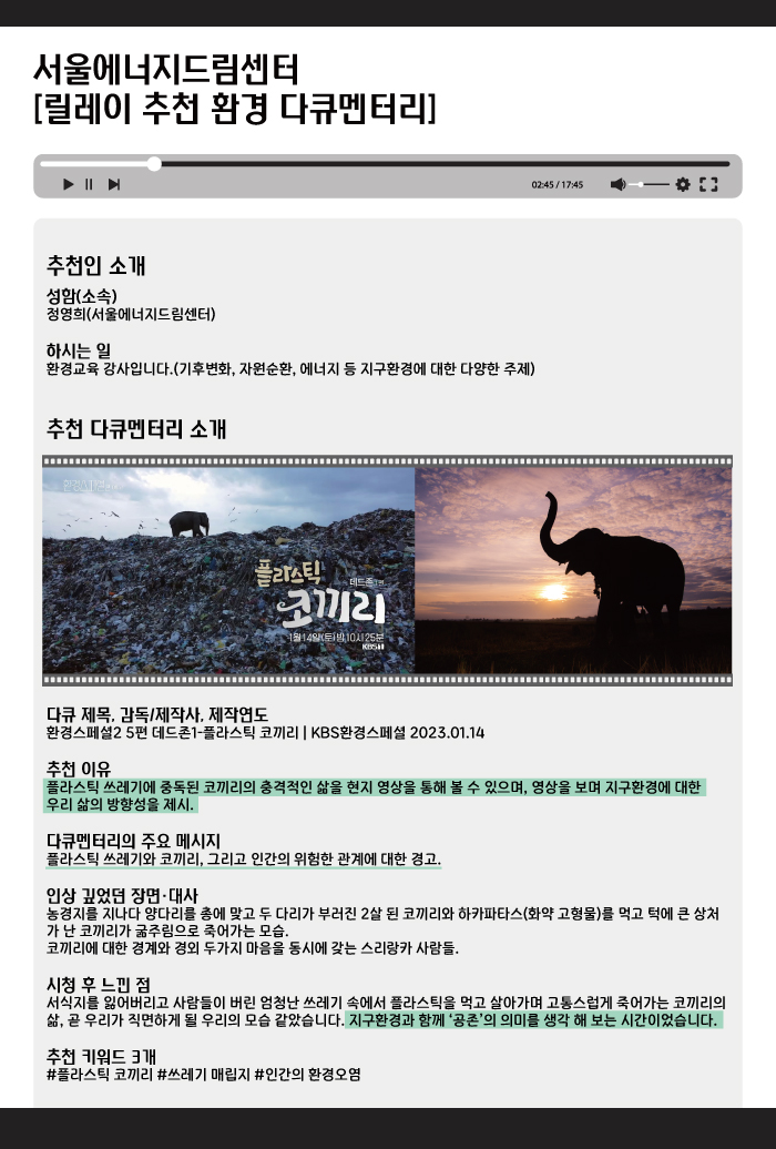 센터리포트 홍보실 센터리포트 센터리포트 프로그램 리뷰 뉴스레터 센터리포트 홍보자료 자료실 SEDC 외부영상 [환경리포트] 릴레이 추천 환경 다큐멘터리 | 환경스페셜2 5편 데드존1 : 플라스틱 코끼리(KBS환경스페셜 2023.01.14 방송) 작성자서울에너지드림센터 등록일2025.11.20 조회수38 다큐 함께보기 이전글 [환경리포트] 릴레이 추천 환경 다큐멘터리 | 조천호의 기후 위기 거대한 전환 : 제3강 거대한 가속과 지구위험한계(EBS교양 2025.02.02 방송) 다음글 [드림센터 이모저모] 2025년 12월 목록