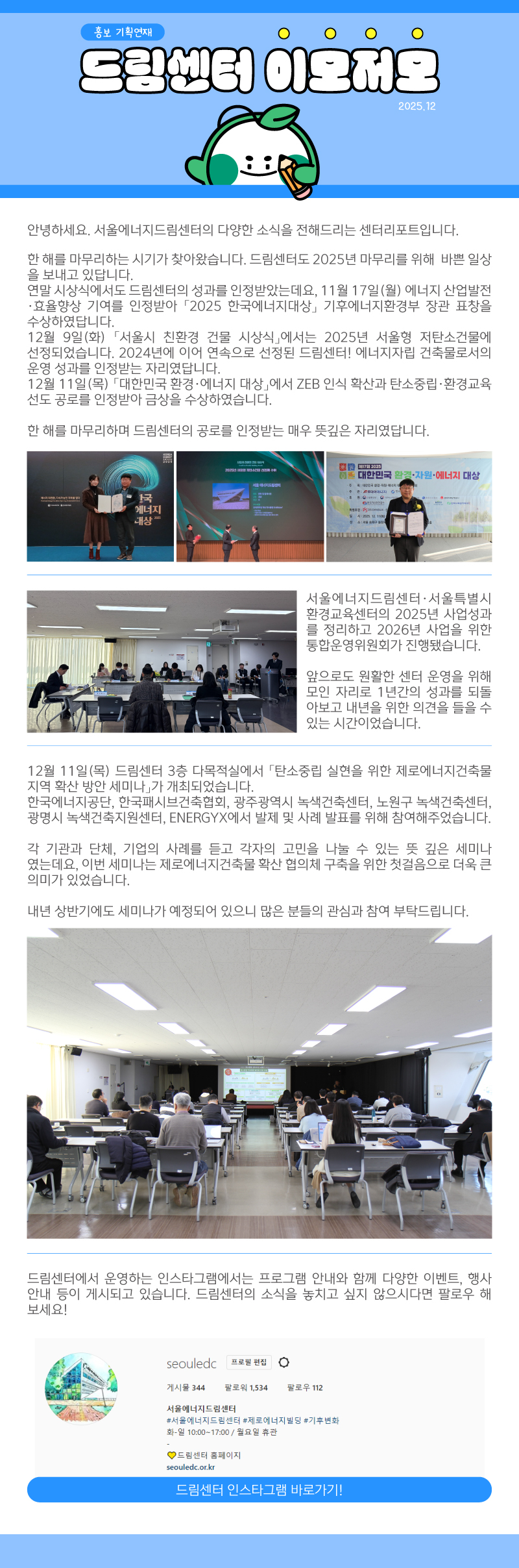 센터리포트 홍보실 센터리포트 센터리포트 프로그램 리뷰 뉴스레터 센터리포트 홍보자료 자료실 SEDC 외부영상 [드림센터 이모저모] 2025년 12월 작성자서울에너지드림센터 등록일2025.12.14 조회수31 이전글 [환경리포트] 릴레이 추천 환경 다큐멘터리 | 환경스페셜2 5편 데드존1 : 플라스틱 코끼리(KBS환경스페셜 2023.01.14 방송) 목록
