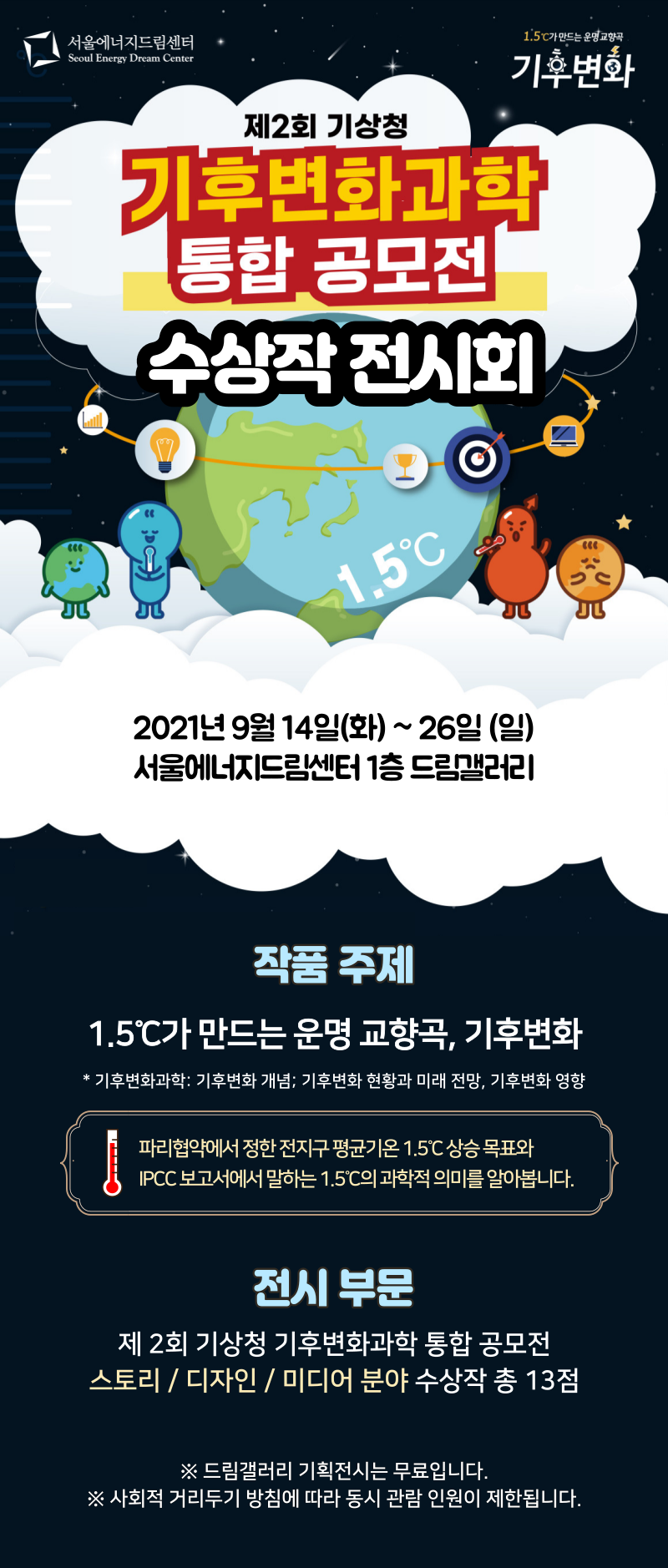 행사 및 전시 교육 및 행사 행사 및 전시 행사 및 전시 교육예약 행사 및 전시 온라인 환경교실 제2회 기상청 기후변화과학 통합 공모전 수상작 전시회 작성자최고관리자 등록일2021.09.12 조회수1832 1.5도가 만드는 운명 교향곡, 기후변화 기후변화의 개념과 현황 그리고 미래전망을 다양한 미디어로 담아내었습니다. 제2회 기후변화과학 통합공모전 수상작들을 만나보세요 썸네일 KakaoTalk_20210909_172620510.png (대표) KakaoTalk_20210912_115214799.jpg KakaoTalk_20210912_115214799_02.jpg KakaoTalk_20210912_115214799_03.jpg KakaoTalk_20210912_115214799_04.jpg 이전글 2021 기상청 기상기후사진공모전 전시회 다음글 제1회 그린리모델링 챌린지 수상작 전시회 목록