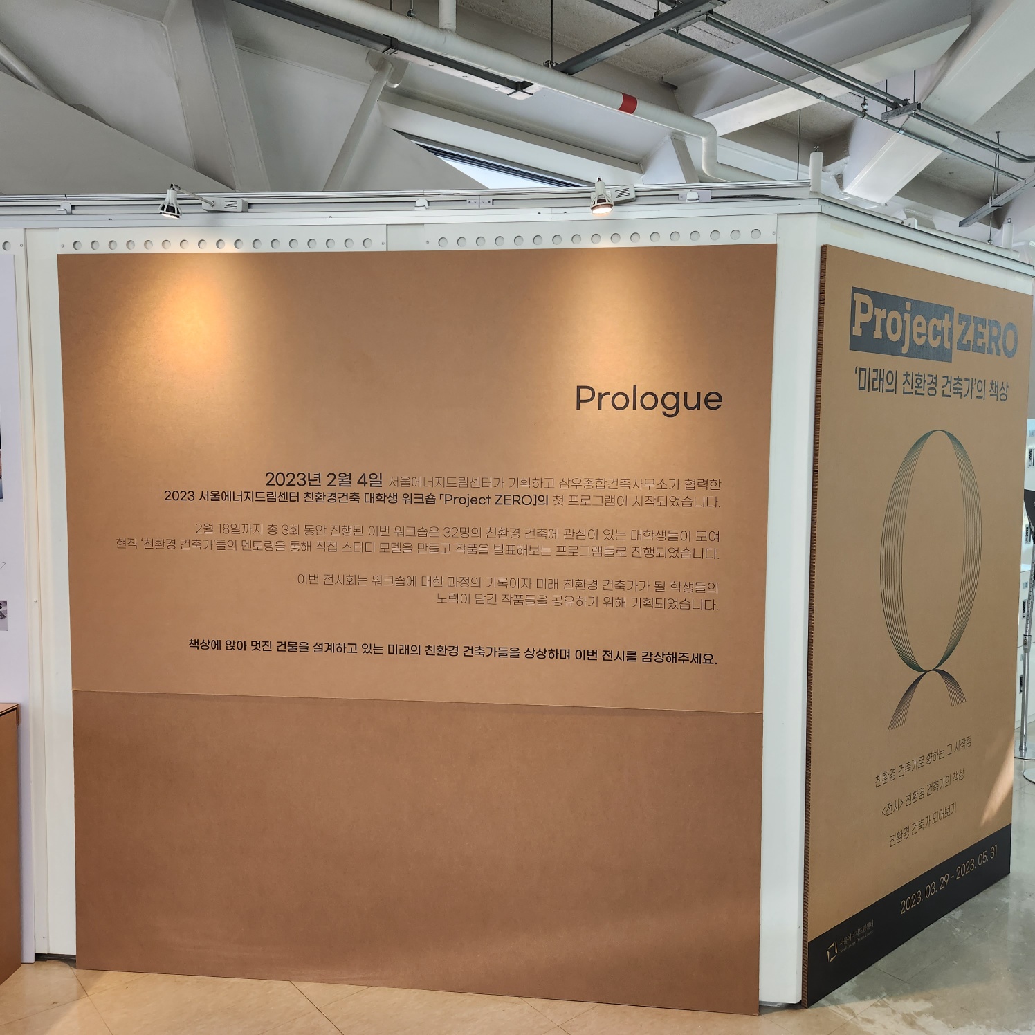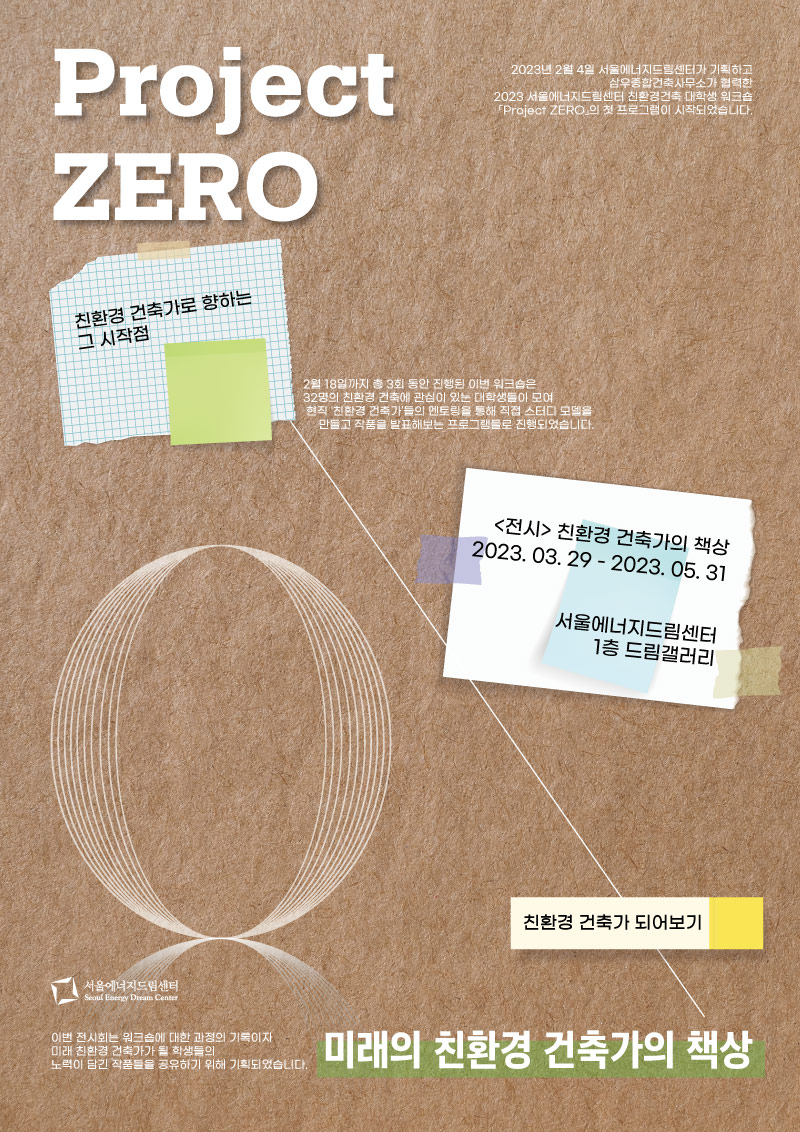 2023년 2월 4일부터 18일까지 진행한 2023 서울에너지드림센터 친환경건축 대학생 워크숍 「Project ZERO」의 결과물 전시회입니다.