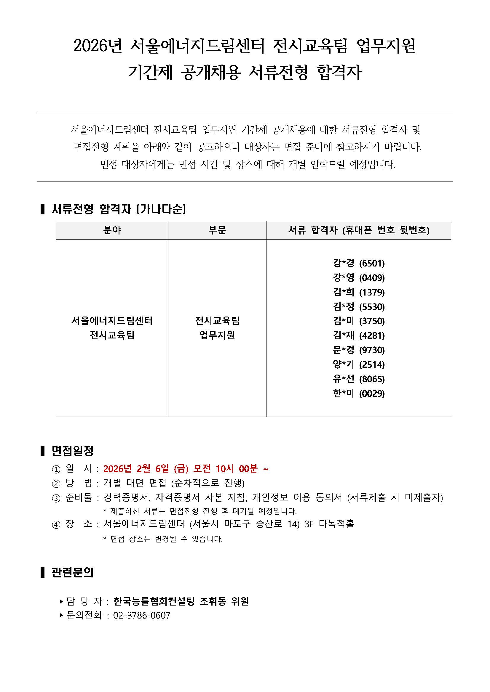 채용안내 열린마당 채용안내 채용안내 공지사항 채용안내 정보공개 서울소식 전자민원 민원신청 [채용] 2026년 서울에너지드림센터 전시교육팀 업무지원 기간제 공개채용 서류전형 합격자 작성자서울에너지드림센터 등록일2026.01.30 조회수32 이전글 [채용] 2026년 서울에너지드림센터 교육사업팀 공개채용 안내 목록