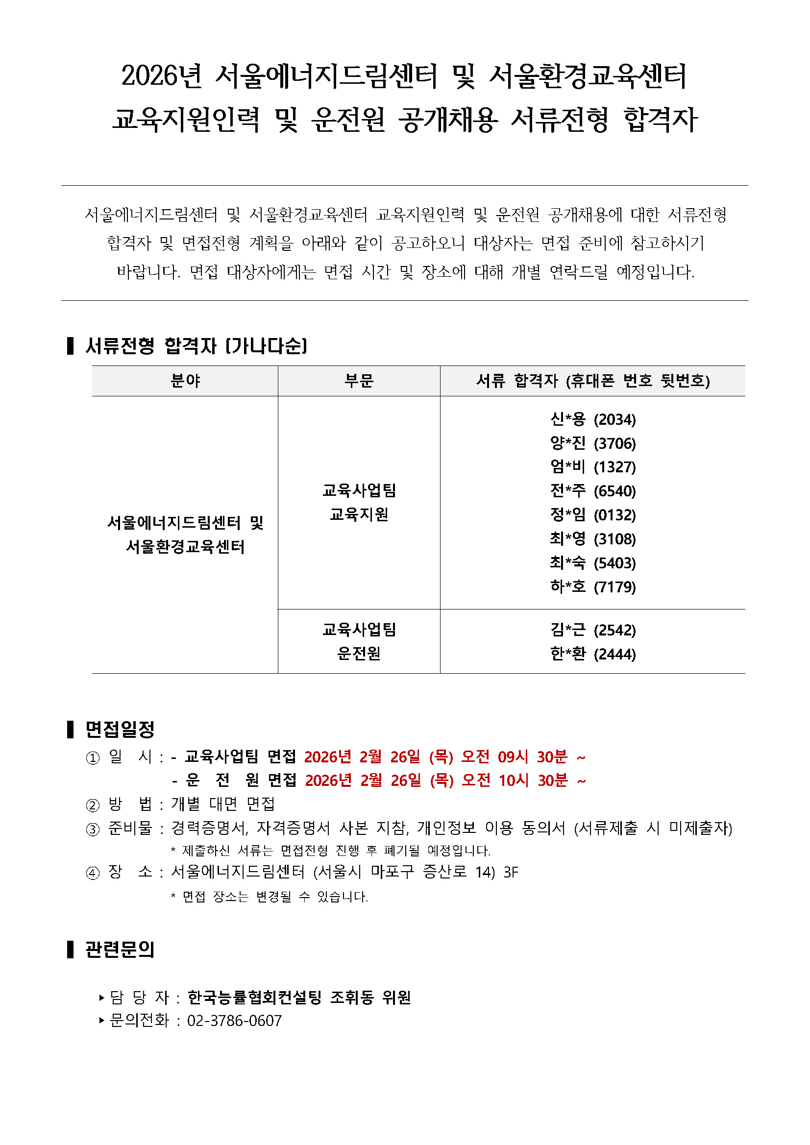 채용안내 열린마당 채용안내 채용안내 공지사항 채용안내 정보공개 서울소식 전자민원 민원신청 [채용] 2026년 서울에너지드림센터 교육사업팀 공개채용 서류전형 합격자 작성자서울에너지드림센터 등록일2026.02.24 조회수109 이전글 [채용] 2026년 서울에너지드림센터 전시교육팀 업무지원 최종 합격자 공고 다음글 [채용] 2026년 서울에너지드림센터 교육사업팀 공개채용 최종 합격자 공고 목록
